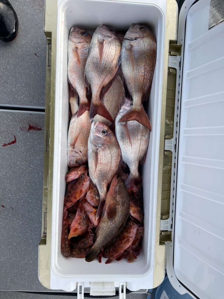 初釣りでした🎍1号艇、2号艇共に集合😍今年もイザナミをよろしくお願い致します🙇♂️ 初釣りは、タイ釣りでした!タイは足裏サイズ主体ですが、竿がしら、10匹程度の釣果となりました